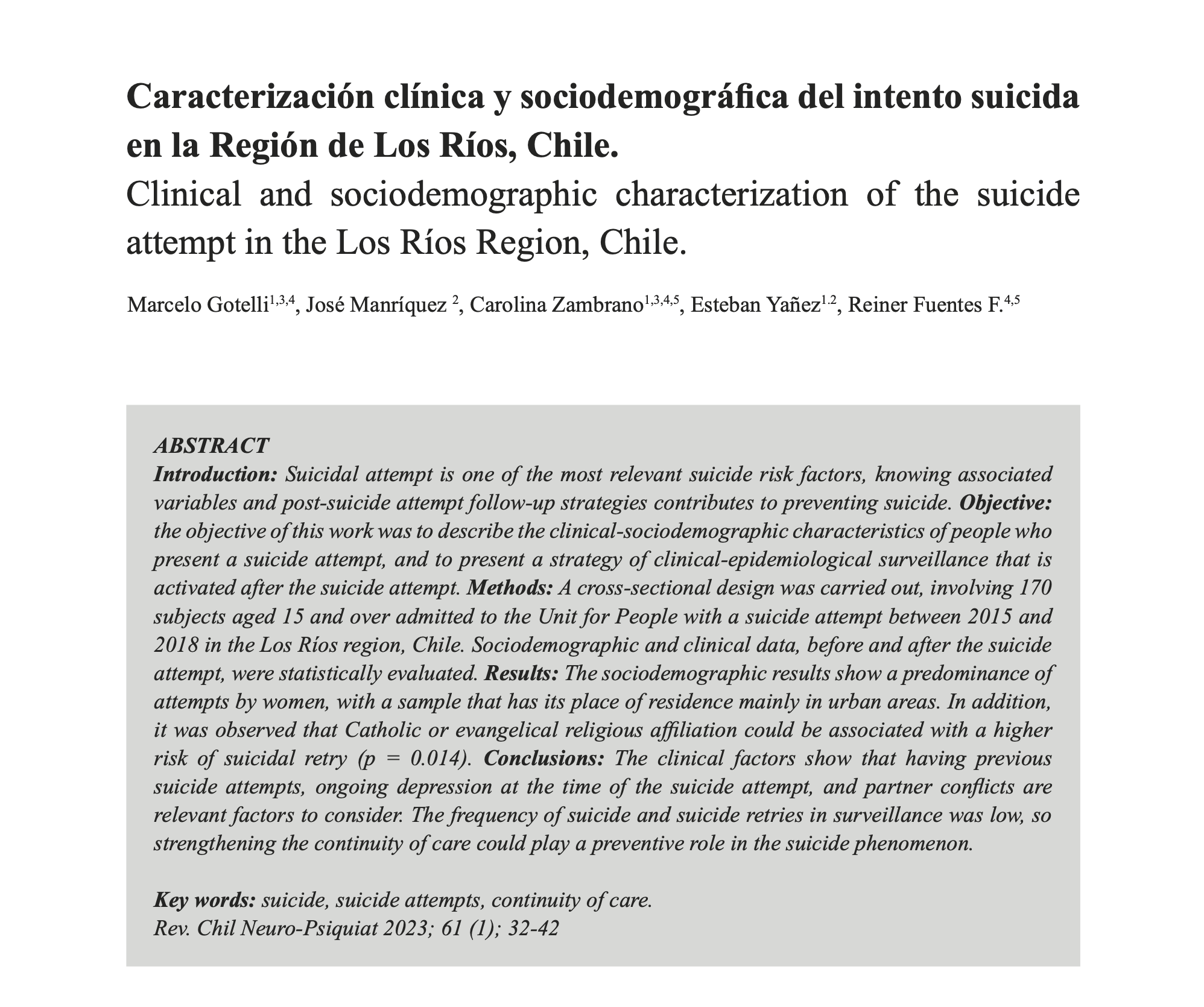 Gotelli, Marcelo, Manríquez, José, Zambrano, Carolina, Yañez, Esteban, & Fuentes F., Reiner. (2023). Clinical and sociodemographic characterization of the suicide attempt in the Los Ríos Region, Chile.. Revista chilena de neuro-psiquiatría, 61(1), 32-42. https://dx.doi.org/10.4067/S0717-92272023000100032